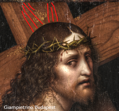 L’étude des veines du bois de la croix confirme ici une inversion du motif entre Le Tableau et les versions attribuées à Giampietrino.