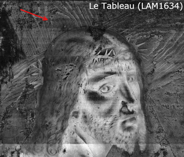 Les images multispectrales permettent d’observer certaines couches picturales sous-jacentes, notamment les veines du bois de la croix autour de la tête du Christ, aujourd’hui à peine visibles. Cette zone a fait l’objet de repeints partiels, très vraisemblablement lors de l’ajout du nimbe.